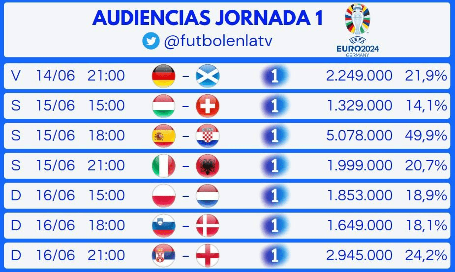 El fútbol en abierto ha demostrado ser un fenómeno de masas. Los partidos de la presente Eurocopa nos están dejando cifras estratosféricas. Uno de los partidos, a priori, menos relevantes del torneo como es un Eslovenia-Dinamarca, consiguió reunir a más de 1.649.000 personas frente al televisor, completando así el 18,1% de share.
